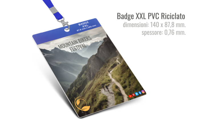 Tessere standard, Badge XXL (in PVC riciclato e cartoncino) e Lanyard sono stampati con la tua grafica, con il logo del tuo evento o la tua ragione sociale. Puoi anche stampare più soggetti grafici e cumulare così più iniziative insieme.